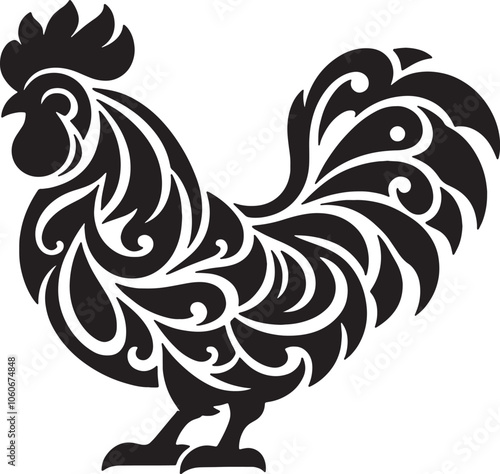 © Mosharof, Obraz premium Decorative rooster silhouette with intricate swirl patterns for artistic designs silhouette