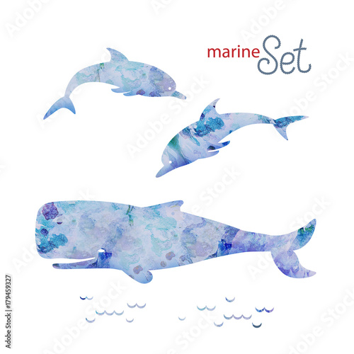 Naklejka premium decorative set of marine animals dolphins and whale