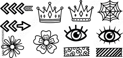 Fototapeta premium Decorative simple black line art icons including arrows, crowns, eyes,...