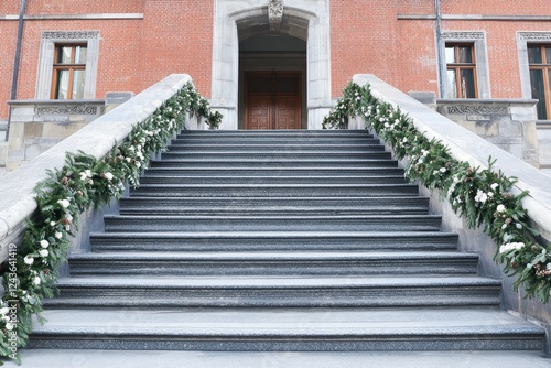 © AHNH3, Obraz premium Decorative Stairs with Greenery and Flowers for Festive Occasion