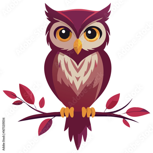 © Maryna, Fototapeta premium Decorative stylized owl perched on branch with red leaves artwork illustration