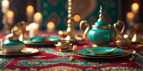 Fototapeta premium Decorative table setting with turquoise tableware and golden accents for an evening gathering in a cozy environment