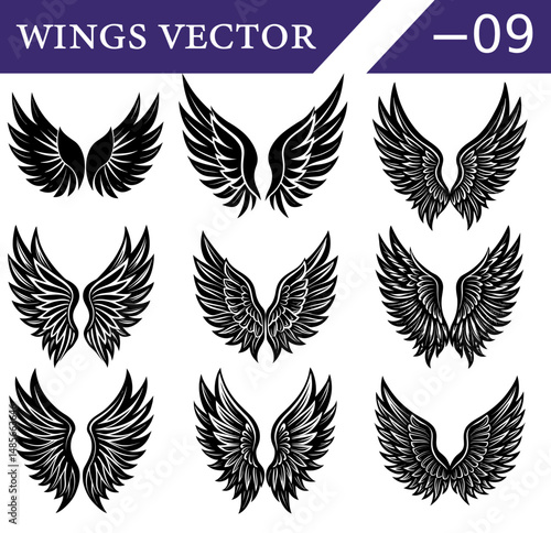 Fototapeta premium Decorative Vector Pack of Black Wings – Gothic Feather Silhouettes of Angel...