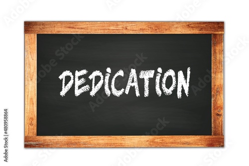 Fototapeta premium DEDICATION text written on wooden frame school blackboard.