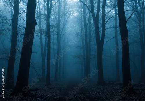 Naklejka premium Deep, atmospheric forest scene drenched in cool blue tones, mist drifting...