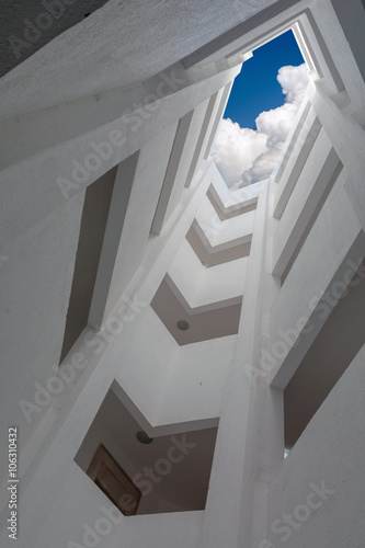 © Sergey T.., Obraz premium deep atrium gray building overlooking the blue sky with clouds