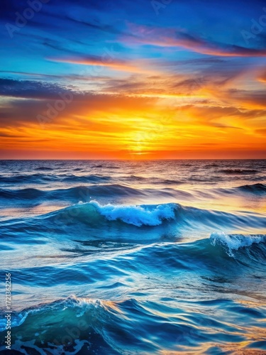 © chokdeelaw, Obraz premium Deep blue abstract wave energy with orange hues in a dreamy ocean scene