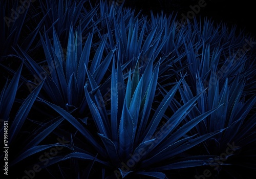 Obraz premium Deep blue agave plants in a dense field creating a dramatic and mysterious...