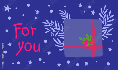 Fototapeta premium deep blue gift-themed illustration with a wrapped present, red berries, green leaves, and stars. Ideal for greeting cards, invitations, and festive decorations.