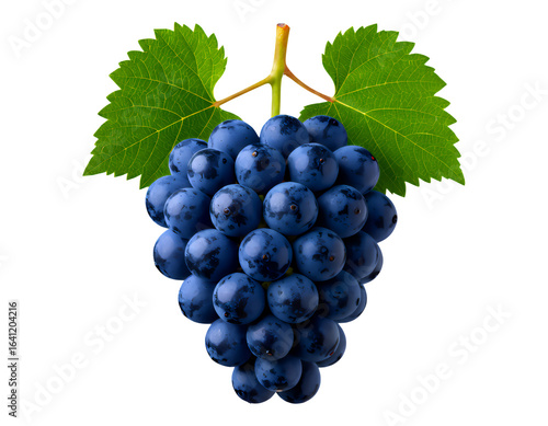 © IllustrationInspire, Fototapeta premium Deep Blue Glossy Grapes Cluster with Green Leaves on Transparent Background, 3D Realism Graphic for Web Design