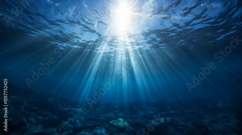 Fototapeta premium Deep blue ocean from below, sunlight streaks through water