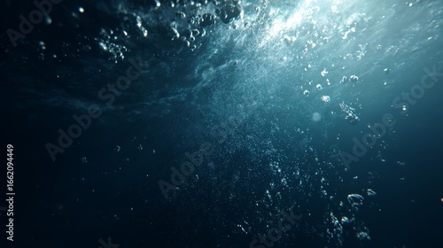 © Peerarut, Fototapeta premium Deep Blue Sea Background with Small Air Bubbles Underwater