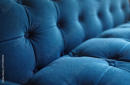 © Viktor, Fototapeta premium Deep blue tufted velvet sofa surface with soft texture. Detailed button tufting creates quilted pattern. Luxurious furniture closeup shows rich fabric detail. Cozy seating comfort and elegant design.