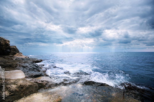 Obraz premium Deep dark blue sea waves breaking on a rocks forming a sea foam.