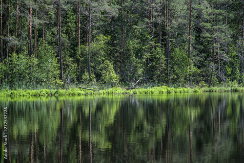 Obraz premium deep dark forest lake with reflections of trees and green foliage