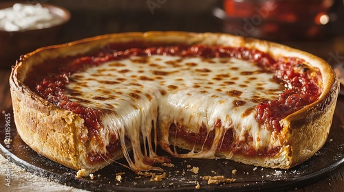 Naklejka premium Deep dish pizza delight chicago style food photography cozy kitchen setting...