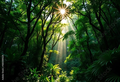 Naklejka premium Deep emerald forest, sunlight dappling through dense canopy, vibrant...