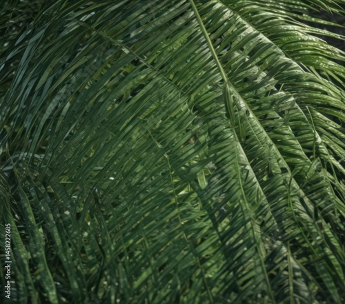 Fototapeta premium Deep emerald palm leaf, intricate venation, sunlight dappled , tropical,...