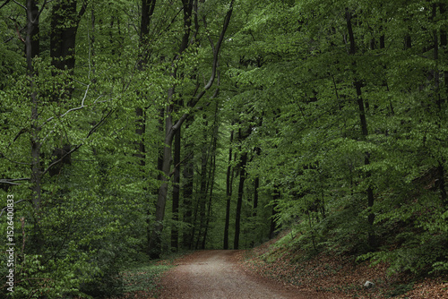 © kri kri, Fototapeta premium Deep european dark forest landscape in cloudy weather, summer forest path leading into the distance