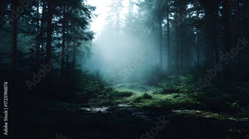 © Bussakon, Fototapeta premium Deep forest clearing with atmospheric fog and natural sunlight