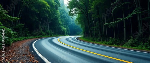 Fototapeta premium Deep forest green textured asphalt road, curving into distance, way,...