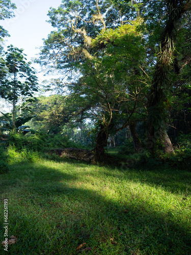 © achmad anshori, Fototapeta premium deep forest, the forest with green grass and big trees standing strong, looks beautiful with the sunshine in spring.