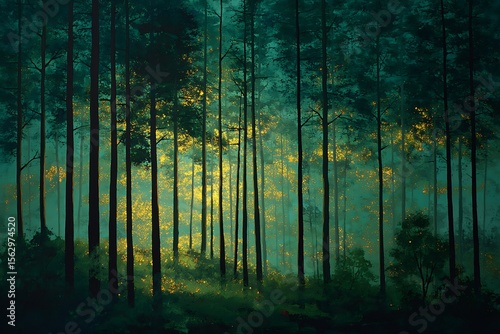 © Akash, Obraz premium deep forest with golden sunlight cutting through dark green shadows