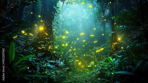 Fototapeta premium Deep Jungle Landscape with Glowing Fireflies