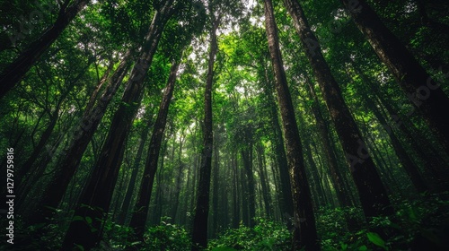 © Sampao, Obraz premium Deep jungle landscape with towering trees and thick vegetation, spacious for text placement.