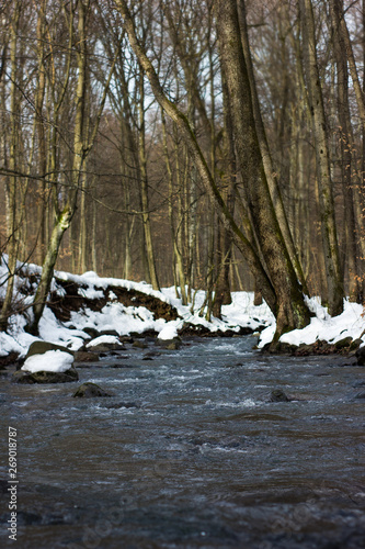 Fototapeta premium Deep lake. Nature. Water. Small river. Winter. Dark forest on background....