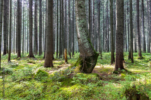 © Michael Sapryhin, Obraz premium Deep moss forest landscape in summer. Background trees.