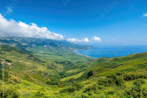 © ArtSpree, Naklejka premium Deep mountain hiking. Atmospheric mountain landscape with great snow-covered pinnacle and snowy pointy peak in blue sky.. Beautiful simple AI generated image