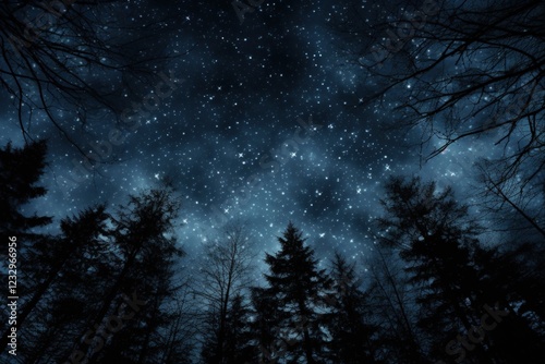 © Vlad, Fototapeta premium Deep Night Sky with Trees Standing Tall. Beautiful Starry Sky and Black Forest. Astronomy and Astrology Background Texture