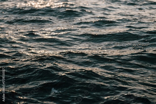 Fototapeta premium Deep Ocean Surface Ripples Reflecting Sunlight Golden Hour Glow