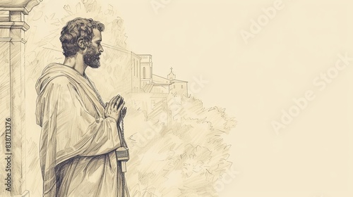 © T Studio, Fototapeta premium Deep prayer of Saint Titus holding a cross, serene church background. Piety and missionary dedication, peaceful and holy atmosphere. Biblical Illustration, Beige Background, copyspace.