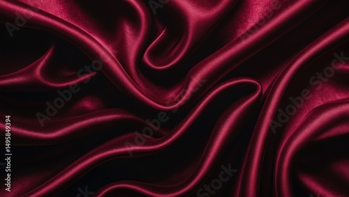 Obraz premium Deep red abstract backdrop featuring burgundy, maroon, cherry, and crimson tones. Satin silk velvet fabric. Rich elegance. Flowing curtain drapery with folds and waves. Design