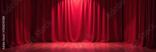 Fototapeta premium Deep red drapes, focused spotlight, expansive view , light, background, drapes