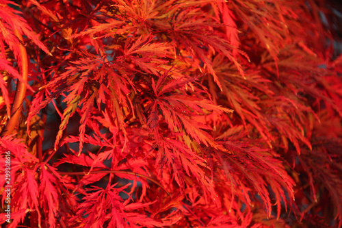 Fototapeta premium Deep red Japanese Maple leaves glowing in the evening sun close up
