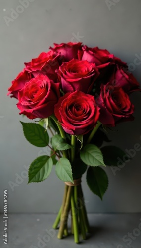 Obraz premium Deep red roses tightly bound, classic bouquet shape, photography, still life