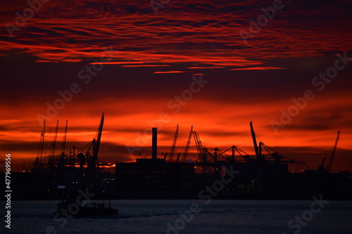 Obraz premium Deep red sky over silhouetted cityscape
