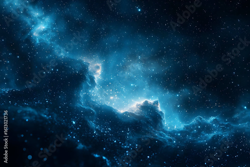 © Hokiia, Fototapeta premium Deep Space Nebula: A 3D Render of Celestial Clouds and Glimmering Stars in a Dark Blue Hues Abstract Background