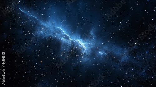 Fototapeta premium Deep space nebula with blue glowing gas and dust clouds, stars scattered across a dark background.