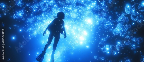 Fototapeta premium Deep underwater, a scuba diver in silhouette drifts through glowing bubbles and shimmering blue light, capturing the essence of ocean exploration