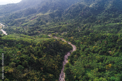© themorningglory, Fototapeta premium Deep waterfall river mountain green forest aerial view