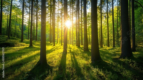 Obraz premium Deep within a dense forest, a hidden clearing is illuminated by the golden light of early evening. The tall trees surrounding the clearing cast long shadows, creating a natural canopy overhead.