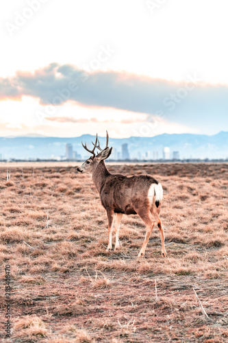 © EG Images, Naklejka premium Deer against a background of Denver skyline