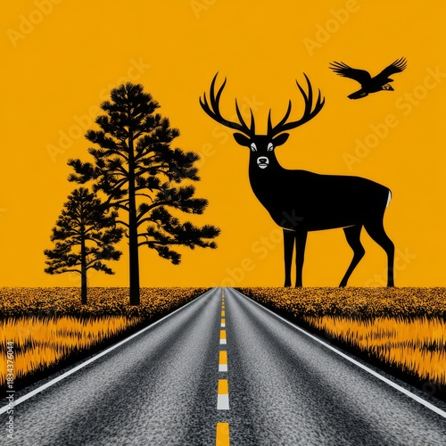 Fototapeta premium Deer and road landscape, stylized graphic, black, yellow, and grey, representing wilderness, travel, and animal habitat