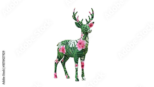 © khafisa, Obraz premium Deer covered in tropical leaves and pink flowers