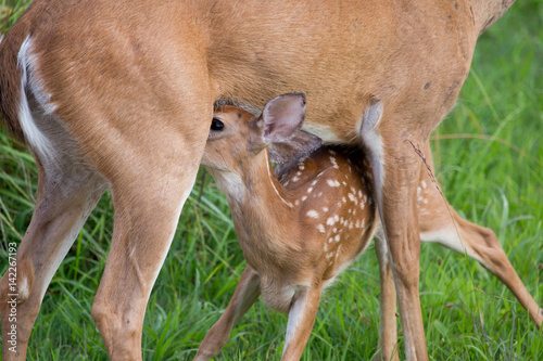 © Mitch, Fototapeta premium Deer fawns with spots cute baby nursing and buck deer in velvet with 6 points or 3x3 including one doe bedded down
