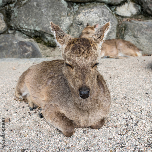 Fototapeta premium Deer grazing in Miyajima island, Hiroshima, Japan